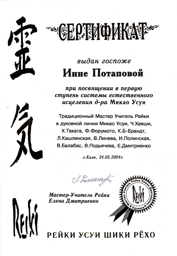 Також тут представлені мої сертифікати посвяти в перший і другий ступінь Рейкі - системи природного зцілення д-ра Мікао Усіу, підвищення кваліфікації у Практичній і сімейній психології та інші.